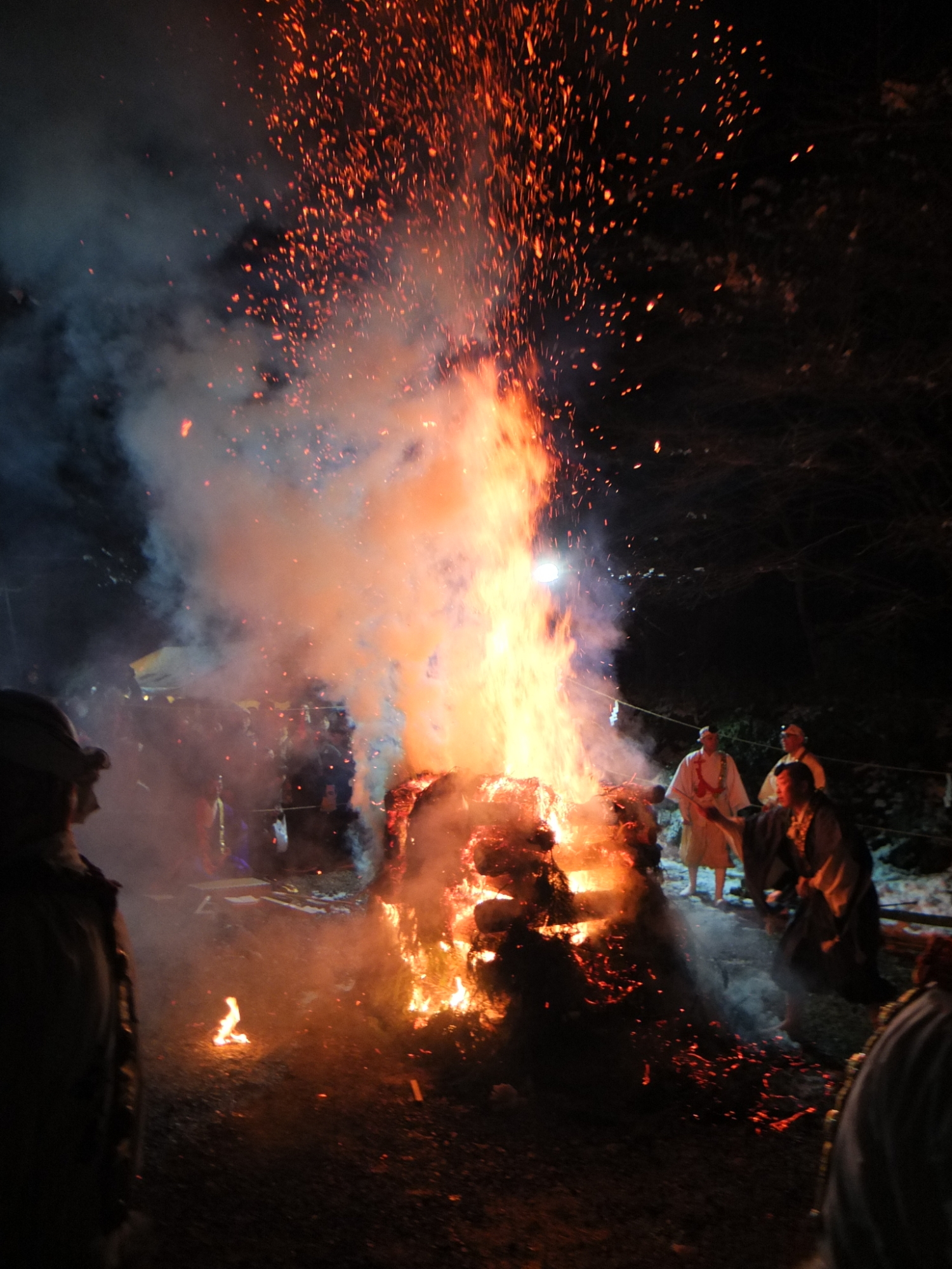 なぜ夕方から参詣者が増えるかというと、19時から山門前で柴燈護摩供が行われ、その後“火渡り”に参加できるからだと思います。柴燈護摩供は、野外に柴を使った護摩壇を設け、道場清めの儀式を行った後、柴と護摩木を燃やして世の中の悪行と病魔を焼き尽くし、残り火の上を裸足で渡って開運長久、無病息災を祈願する儀式です。たくさんの修験者(山伏)さんが儀式の節目々々で法螺貝を吹かれる姿を見ることもできます(一応オーナーも大峰山で小先達の免状をいただいて法螺貝を所持していますので、“初こくぞう”で法螺貝の音を聞くのを楽しみにしています)。